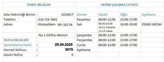 Dr. Selen Esen Şendaş, Hemşire Elif Bilge Beceren ile birlikte hizmet vermektedir. Gezici mobil hizmeti yoktur. Her salı günü esnek mesai yapmaktadır.