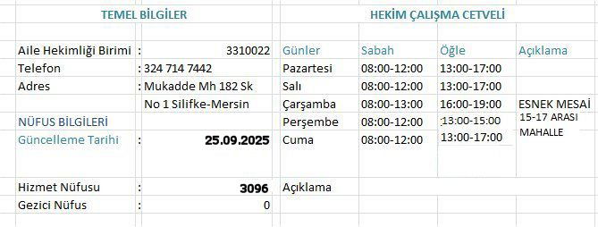 3310022 Nolu AHB de Aile Hekimi olarak görev yapan Dr. Yüksel Eren, Hemşire Kader Ekinci ile birlikte hizmet vermektedir. Her çarşamba günü esnek mesaisi vardır. Gezici köy hizmeti yoktur